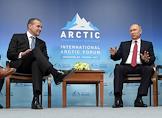 IV Международный Арктический форум "Арктика – территория диалога". Президент России Владимир Путин (справа) во время заседания форума.