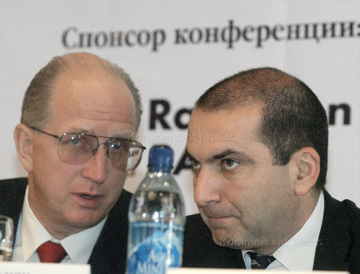 Заместитель председателя Центрального банка России Виктор Мельников (слева) и президент Ассоциации Банков Центральной России (АРБ) Гарегин Тосунян (справа) на Международной научно-практической конференции "Актуальные вопросы деятельности банков по противодействию отмыванию преступных доходов и финансирования терроризма". Конференция прошла в "Марриотт Гранд-отеле".