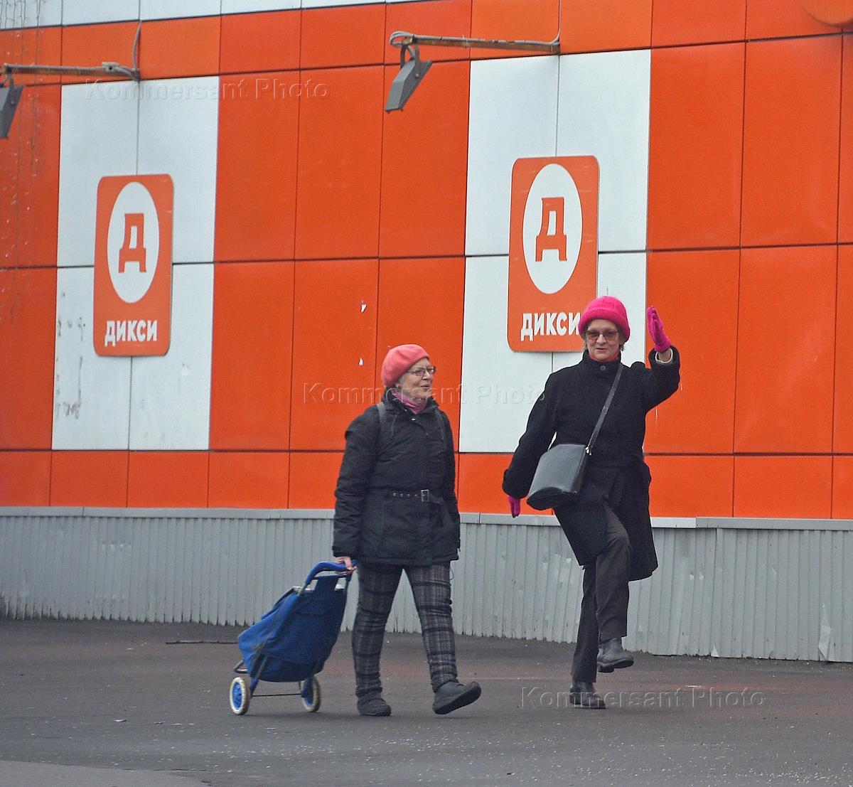 Магазин розничной сети "Дикси". Женщины идут вдоль стены магазина.