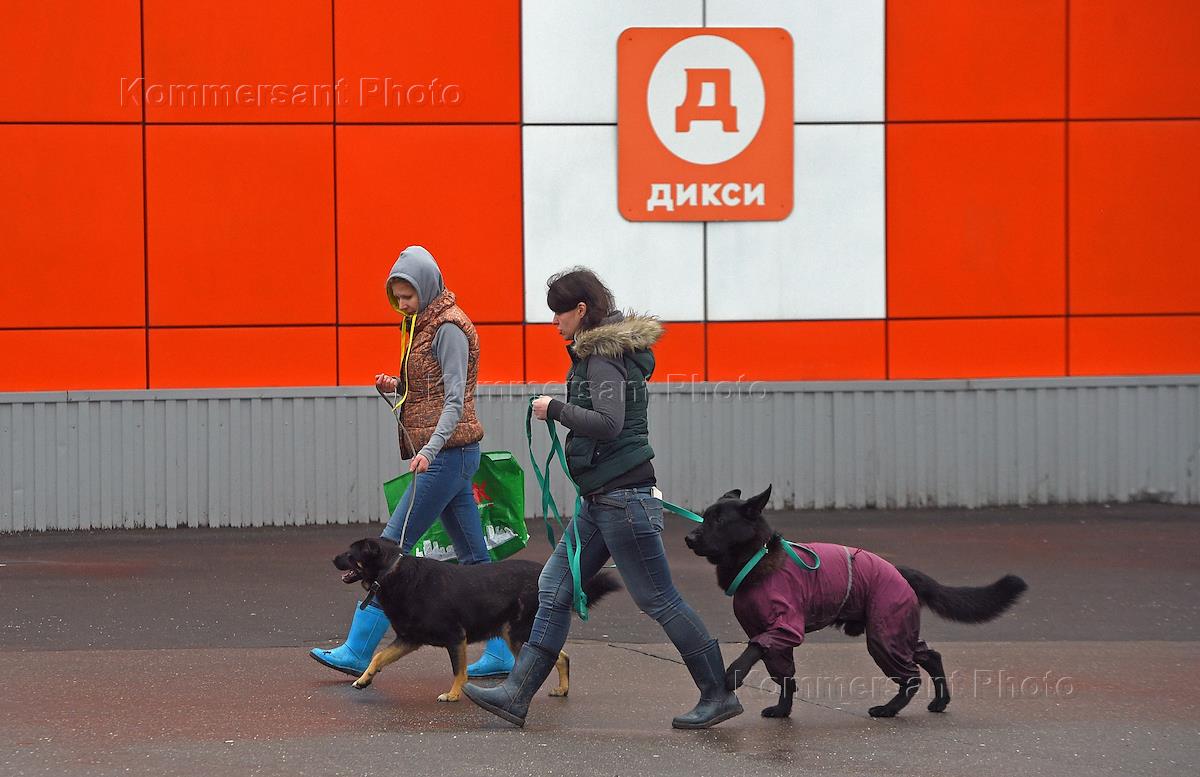Магазин розничной сети "Дикси". Девушки с собаками идут вдоль стены магазина.