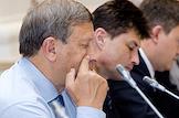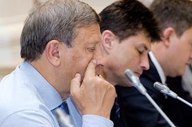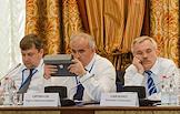 Совместное выездное заседание Совета при полномочном представителе президента России в Центральном Федеральном округе. Слева направо: губернатор Тверской области Андрей Шевелев, губернатор Костромской области Сергей Ситников и губернатор Белгородской области Евгений Савченко на заседании в Правительстве Воронежской области.