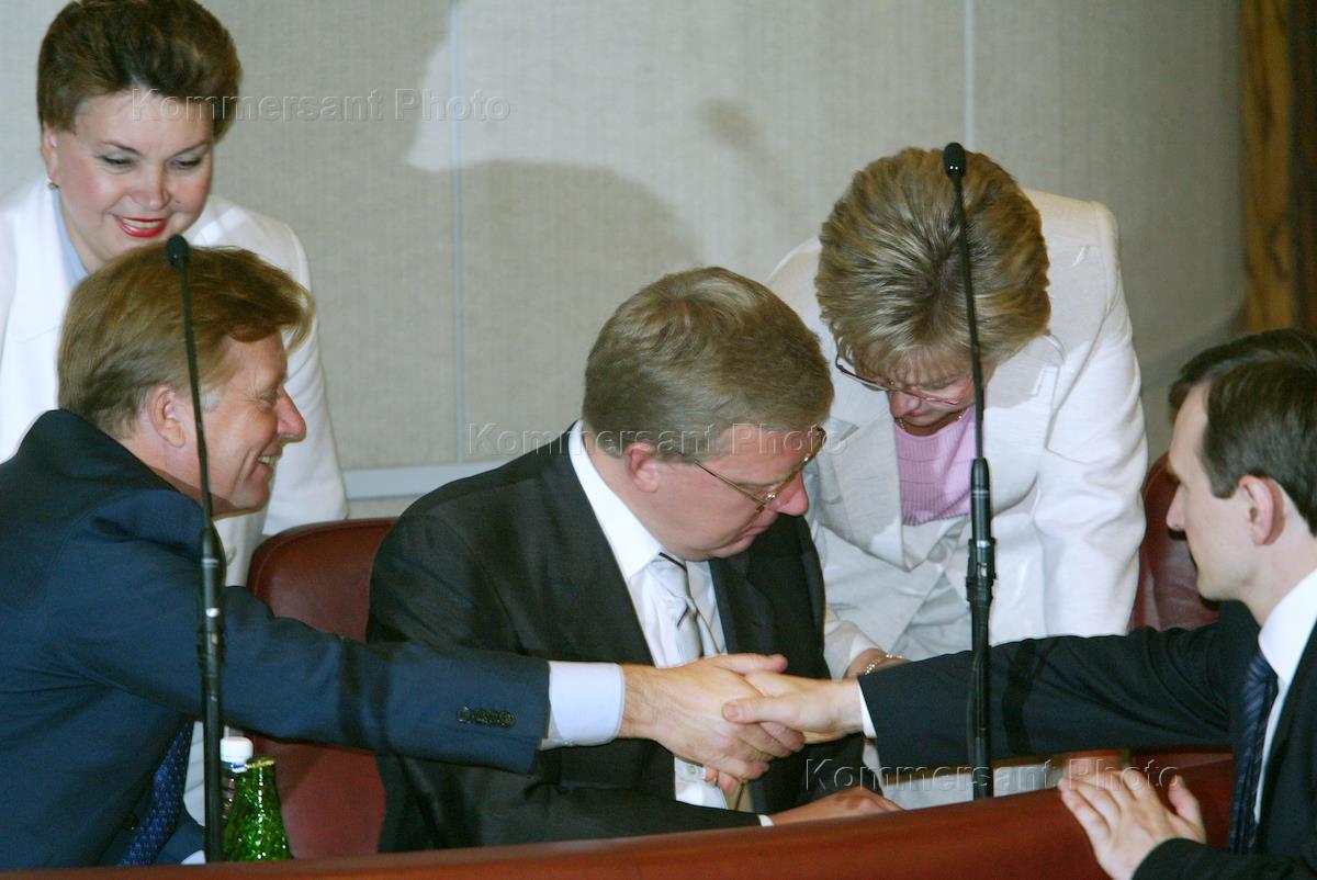 Russian Olympic Committee president Leonid Tyagachev (left) and finance minister Alexei Kudrin (centre) attended the State Duma meeting where was discussed the "Federal budget 2004" project.