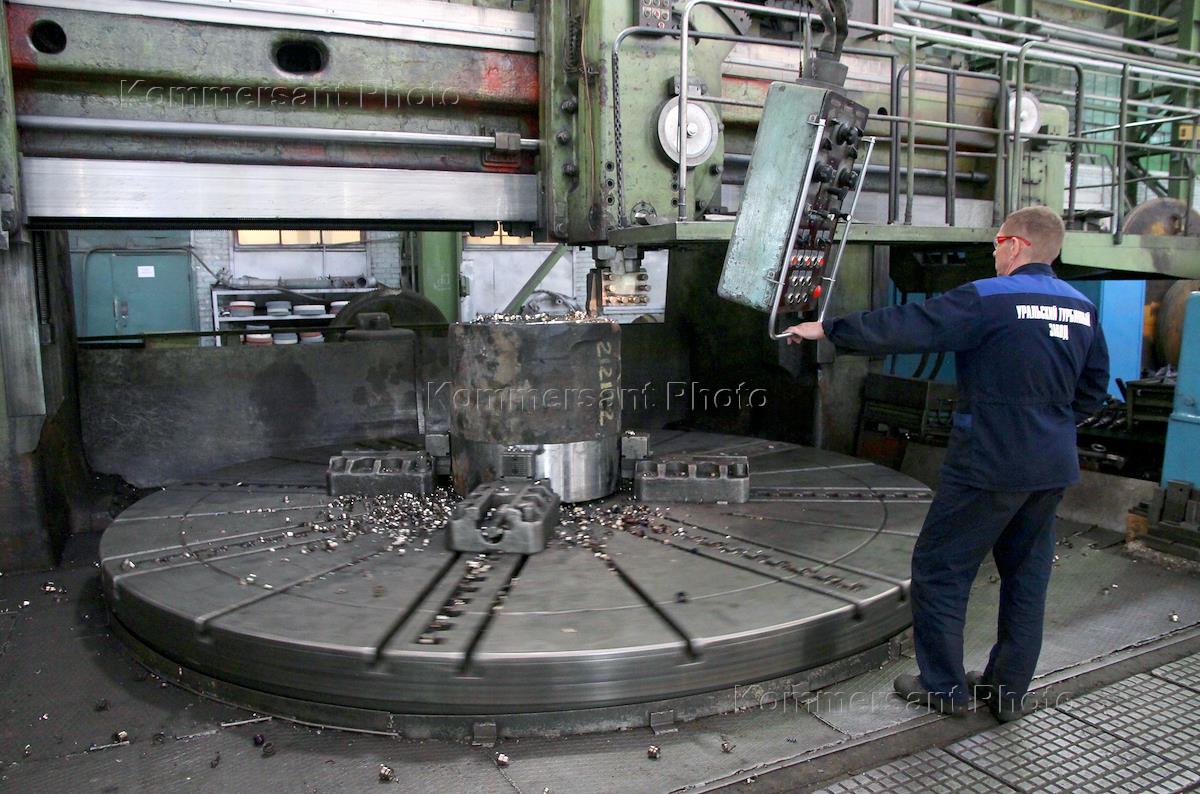 Рабочий за токарно-карусельным станком в цехе ЗАО "Уральский турбинный завод" (ЗАО "УТЗ").