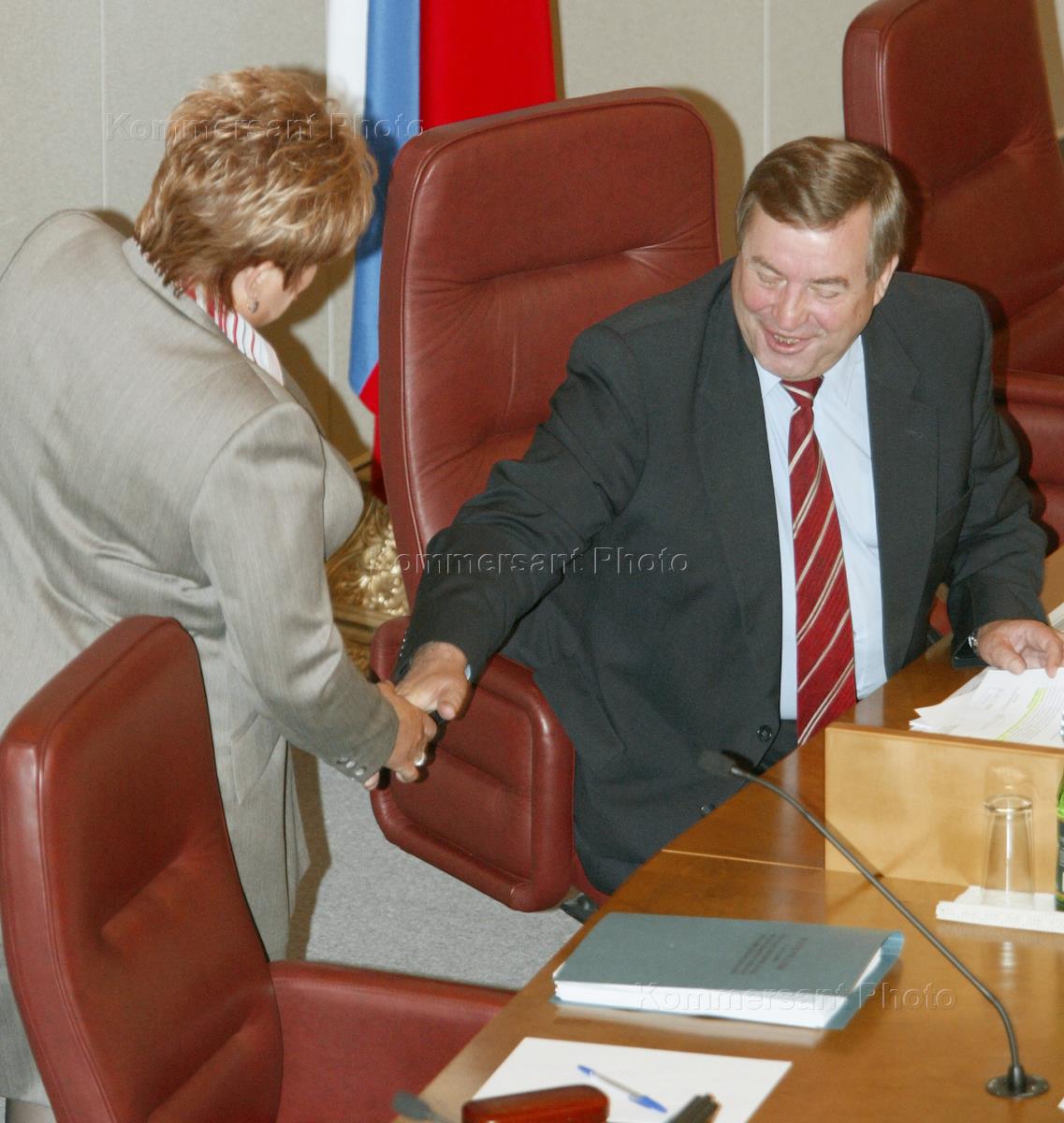 Speaker of the State Duma (lower house of parliament) Gennady Seleznev (right) greets vice speaker Lyubov Sliska at a session of the legislature.