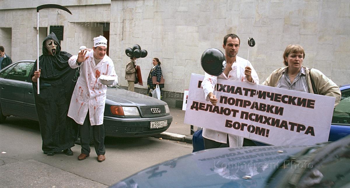 Activists of the Civil Human Rights Committee stage a masked show pikekting the Serbsky Psychiatric Institute. The picket was staged to denounce psychiatric experiments allegedly carried out by doctors in the Russian prisons.