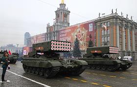 Праздничные мероприятия, посвященные 70-й годовщине Победы в Великой Отечественной войне 1941–1945 годов, прошли в Екатеринбурге. Войска Екатеринбургского гарнизона во время Парада Победы на площади 1905 года. Тяжелая огнеметная система ТОС-1.