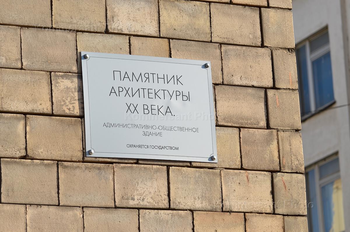 Жанровая фотография. Вывеска на стене старого здания: "Памятник архитектуры 20 века. Административно-общественное здание. Охраняется государством".