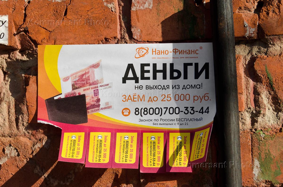 Жанровая фотография. Объявление на фонарном столбе компании "Нано-финанс": "Деньги не выходя из дома. Заем до 25 тыс. рублей" на фонарном столбе.
