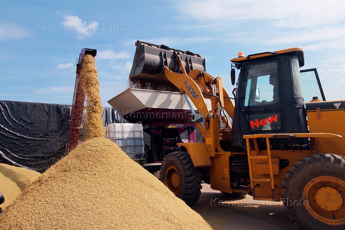 Выгрузка зерна в зернохранилище фермерского хозяйства.