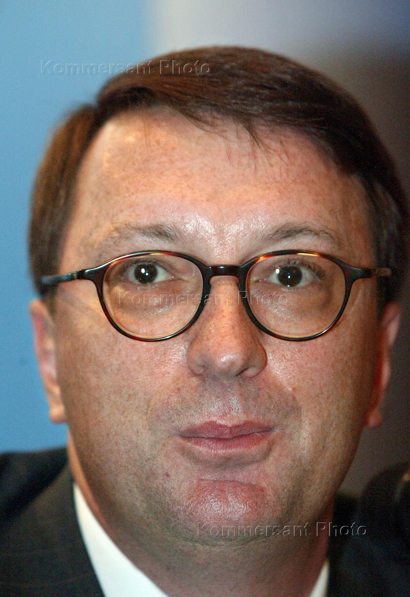 Президент, председатель правления Внешторгбанка Андрей Костин на церемонии подписания договора о предоставлении ОАО "Аэрофлот - российские авиалинии" синдицированного кредита. Инициаторами и уполномоченными ведущими организаторами кредита выступают Внешторгбанк и Донау-Банк АГ (Вена). Церемония прошла в зале "Кусковский" "Марриотт-Гранд-отеля".