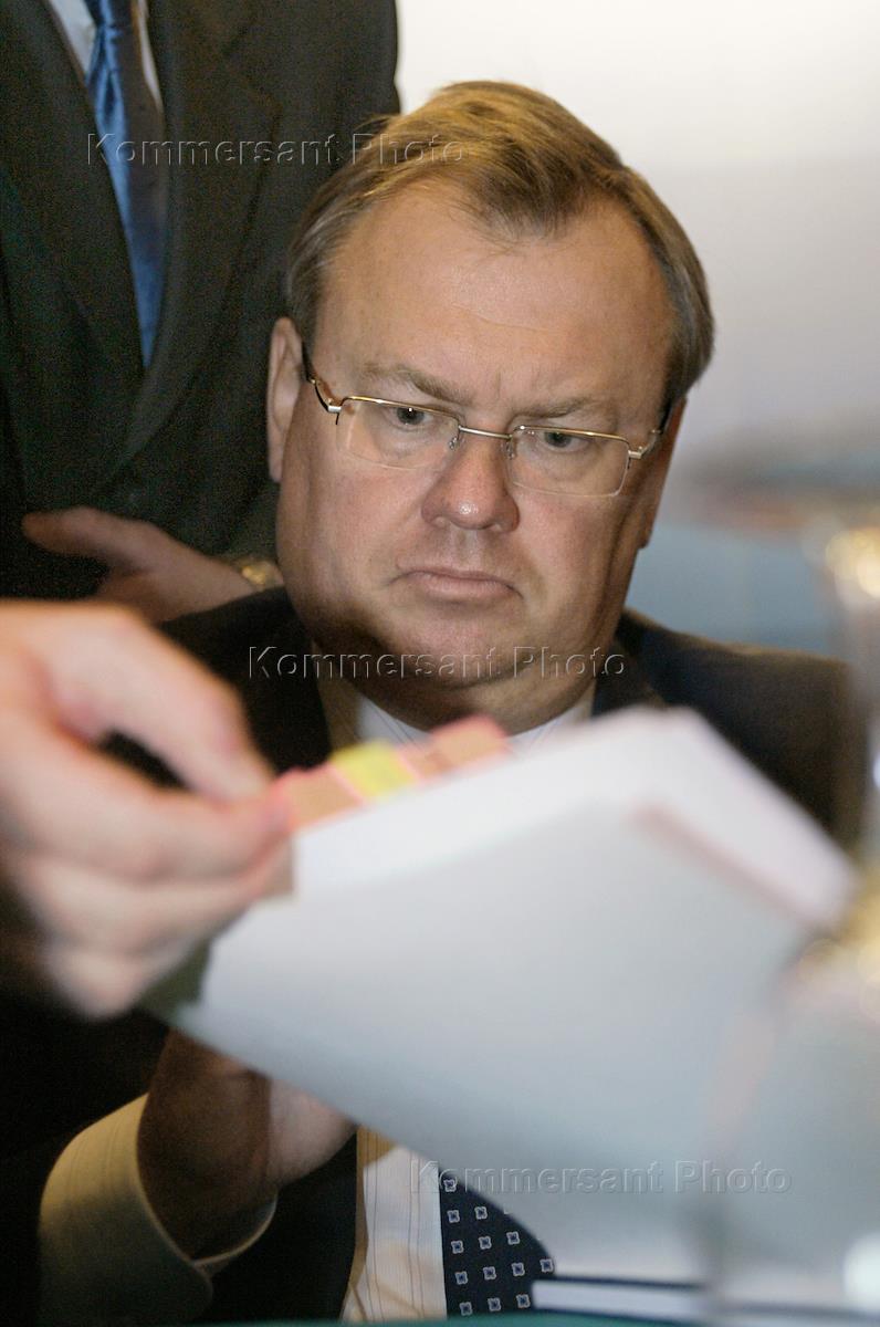 Генеральный директор ОАО "Аэрофлот" Валерий Окулов на церемонии подписания договора о предоставлении ОАО "Аэрофлот - российские авиалинии" синдицированного кредита. Инициаторами и уполномоченными ведущими организаторами кредита выступают Внешторгбанк и Донау-Банк АГ (Вена). Церемония прошла в зале "Кусковский" "Марриотт-Гранд-отеля".