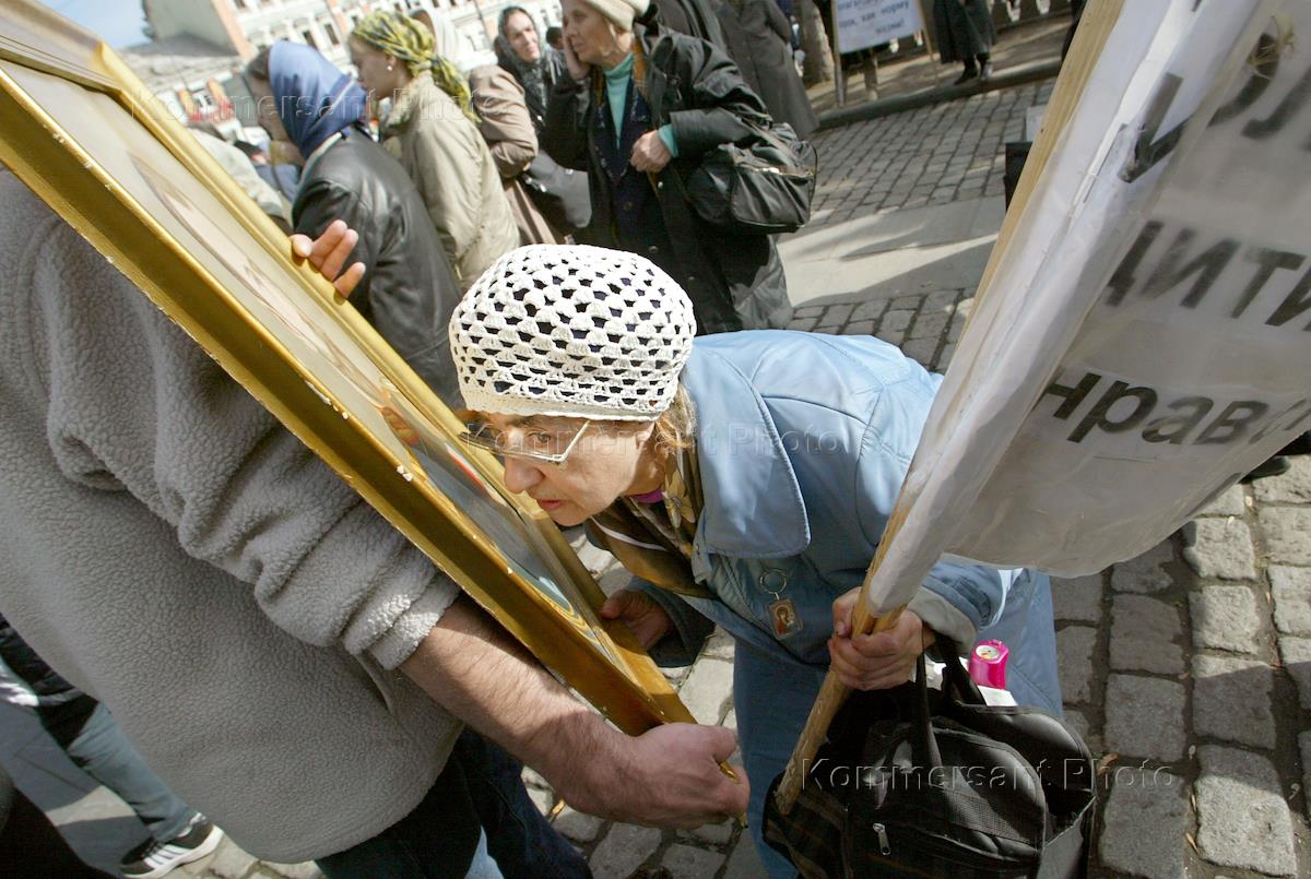 Крестный ход, посвященный празднику Рождества Пресвятой Богородицы и 623-й годовщине победы русского оружия на Куликовом поле. Крестный ход, организованный сторонниками православно-монархических организаций города, прошел от Славянской площади до храма Василия Блаженного. Женщина целует портрет Николая II.