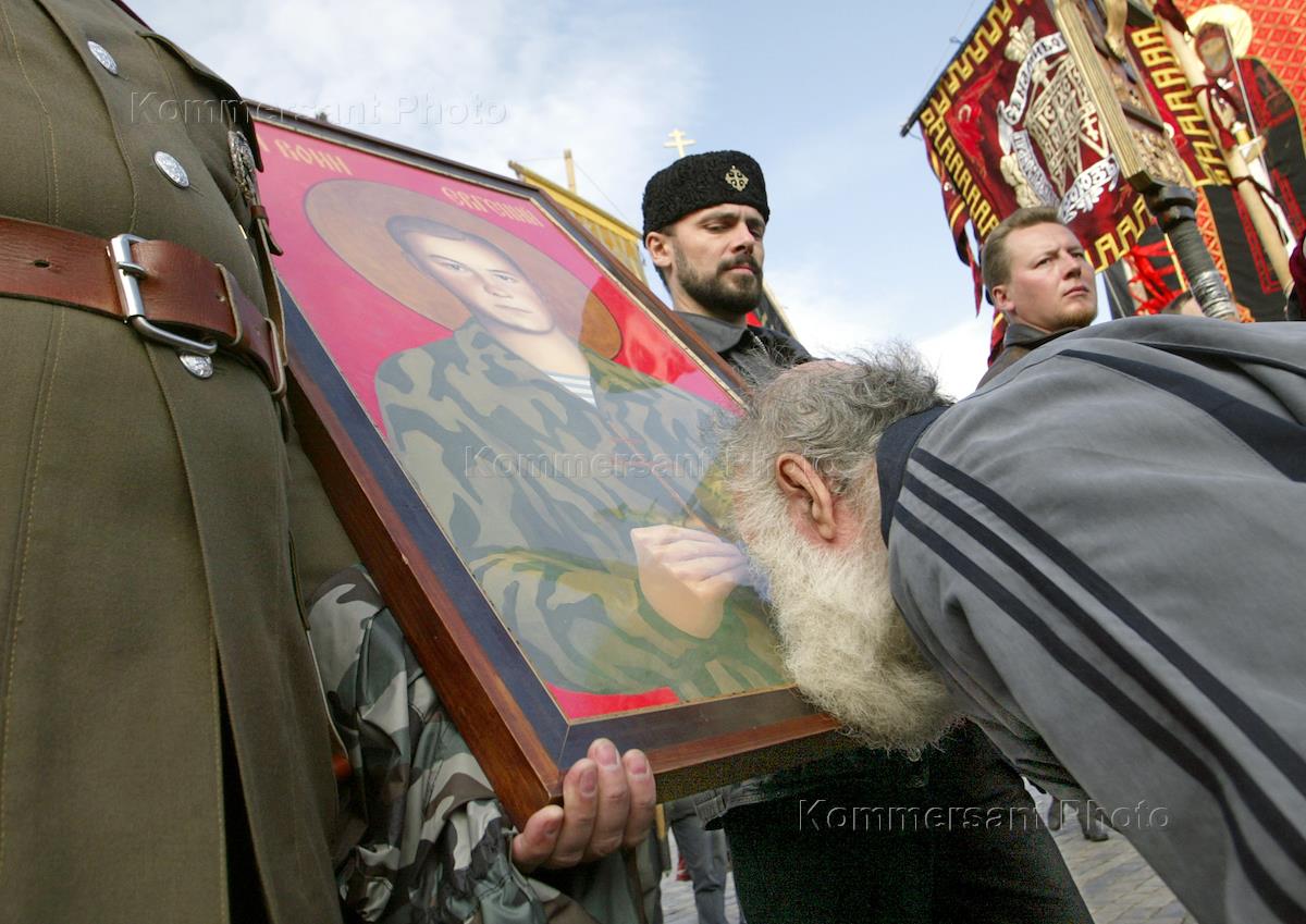 Крестный ход, посвященный празднику Рождества Пресвятой Богородицы и 623-й годовщине победы русского оружия на Куликовом поле. Крестный ход, организованный сторонниками православно-монархических организаций города, прошел от Славянской площади до храма Василия Блаженного. Женщина целует портрет Николая II.