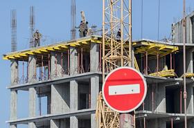 Жанровая фотография. Знак "Въезд запрещен" (кирпич) на фоне строящегося дома.