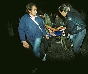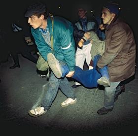 Supporters of the Russian Supreme Council (parliament under the old constitution, disbanded by Boris Yeltsin in 1993) carry a comrade wounded during the attack on the Ostankino TV-centre.