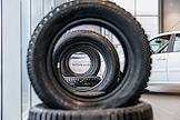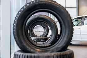Жанровая фотография. Шипованные шины Cordiant Polar SL в автосалоне по продаже автомобилей Datsun.