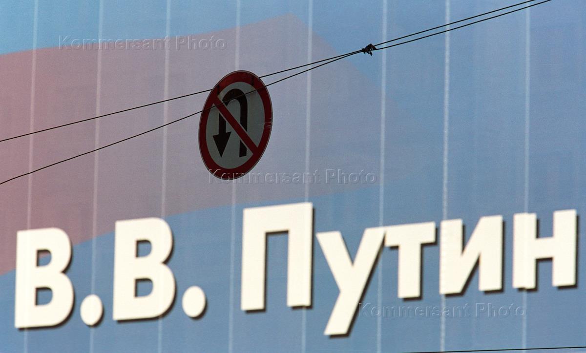 Рекламный щит "...В.В.Путин" и автомобиль со спецсигналом.