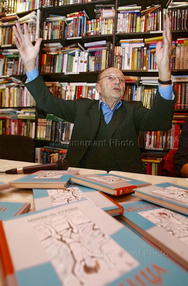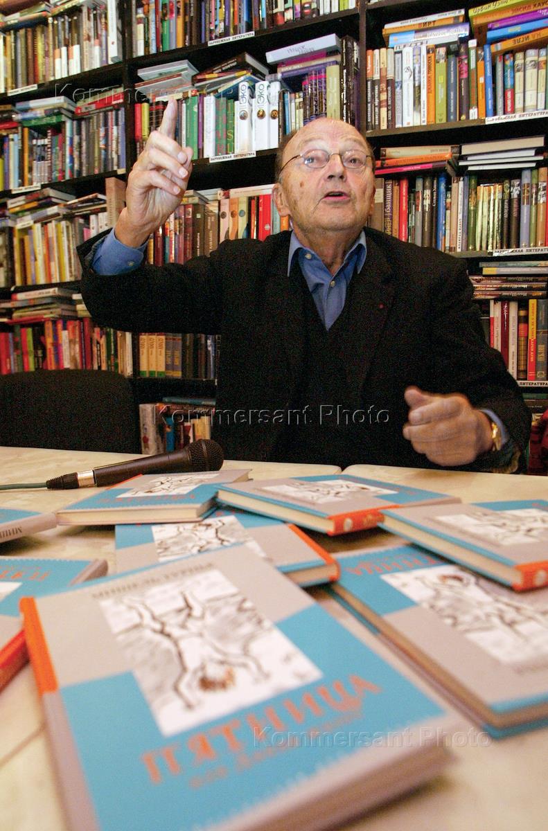 Французский писатель Мишель Турнье подписывает свою книгу после пресс-конференции в книжном магазине "Фаланстер".