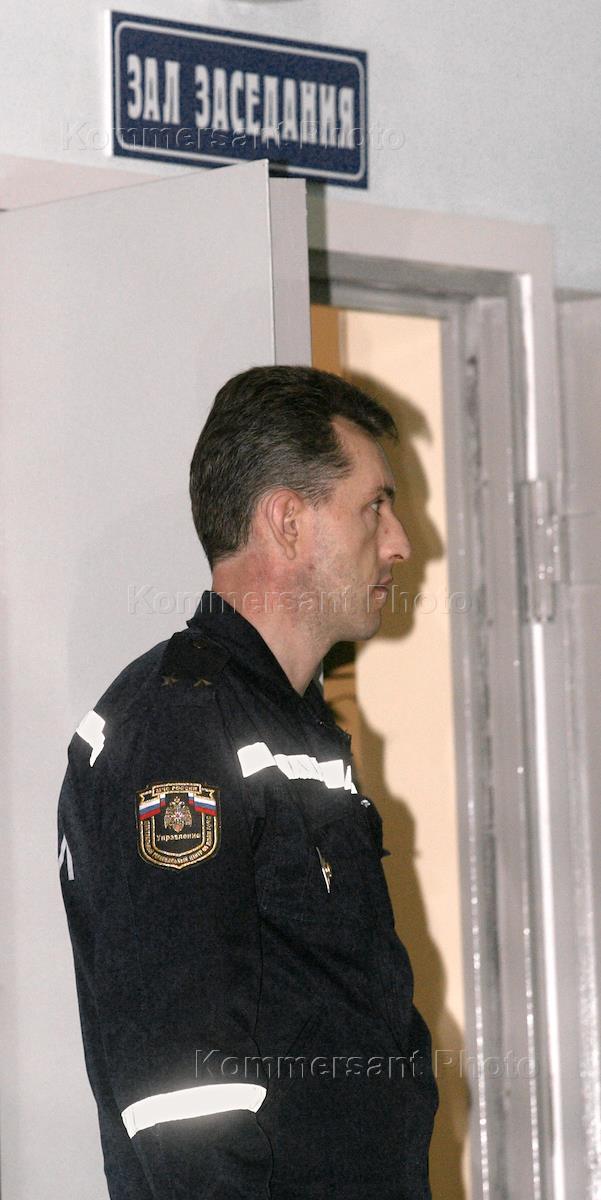A security officer stands at the entrance of the hall where was held the meeting of the Central Federal District chiefs and Emergency Situations Ministry board. The event was held in the Chekhov.