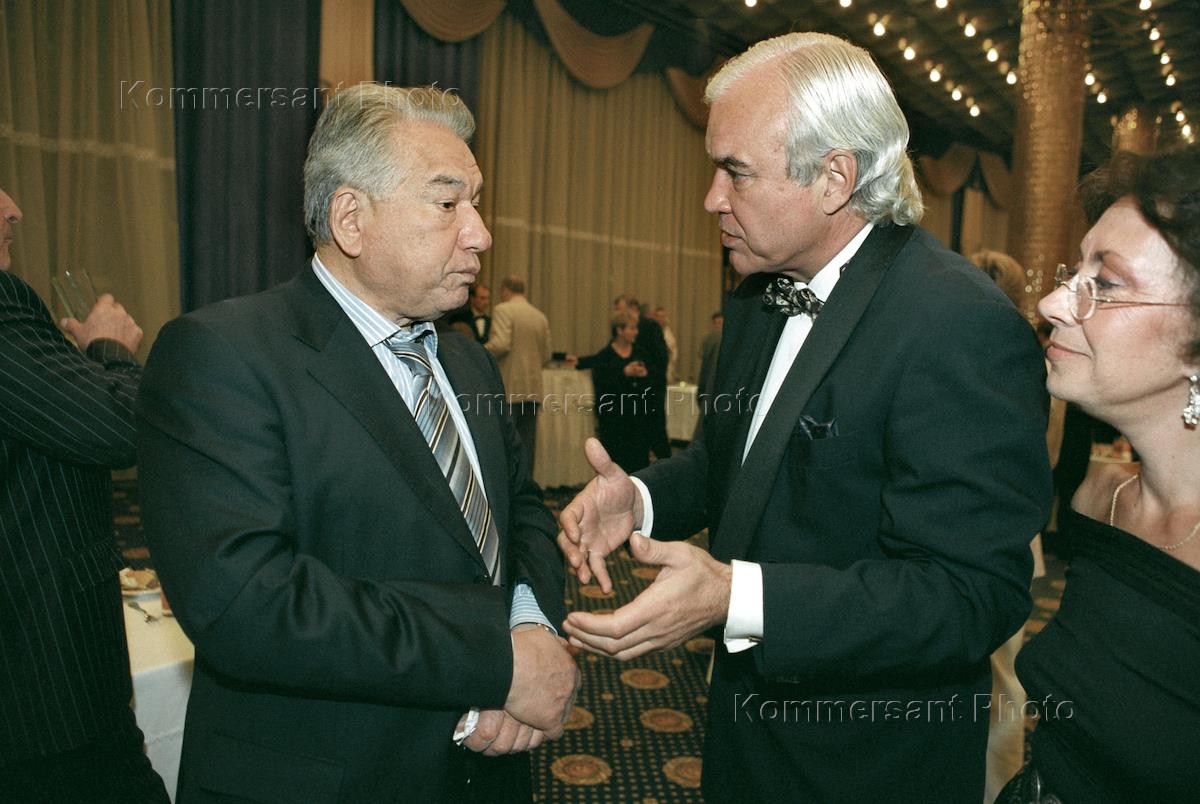 Kyrgyz writer Chingiz Aytmatov (left) talks to TV host Vladimir Molchanov (centre) during the party held after the TEFI-2003 television awards ceremony. The event took place in the Rossiya Concert Hall.