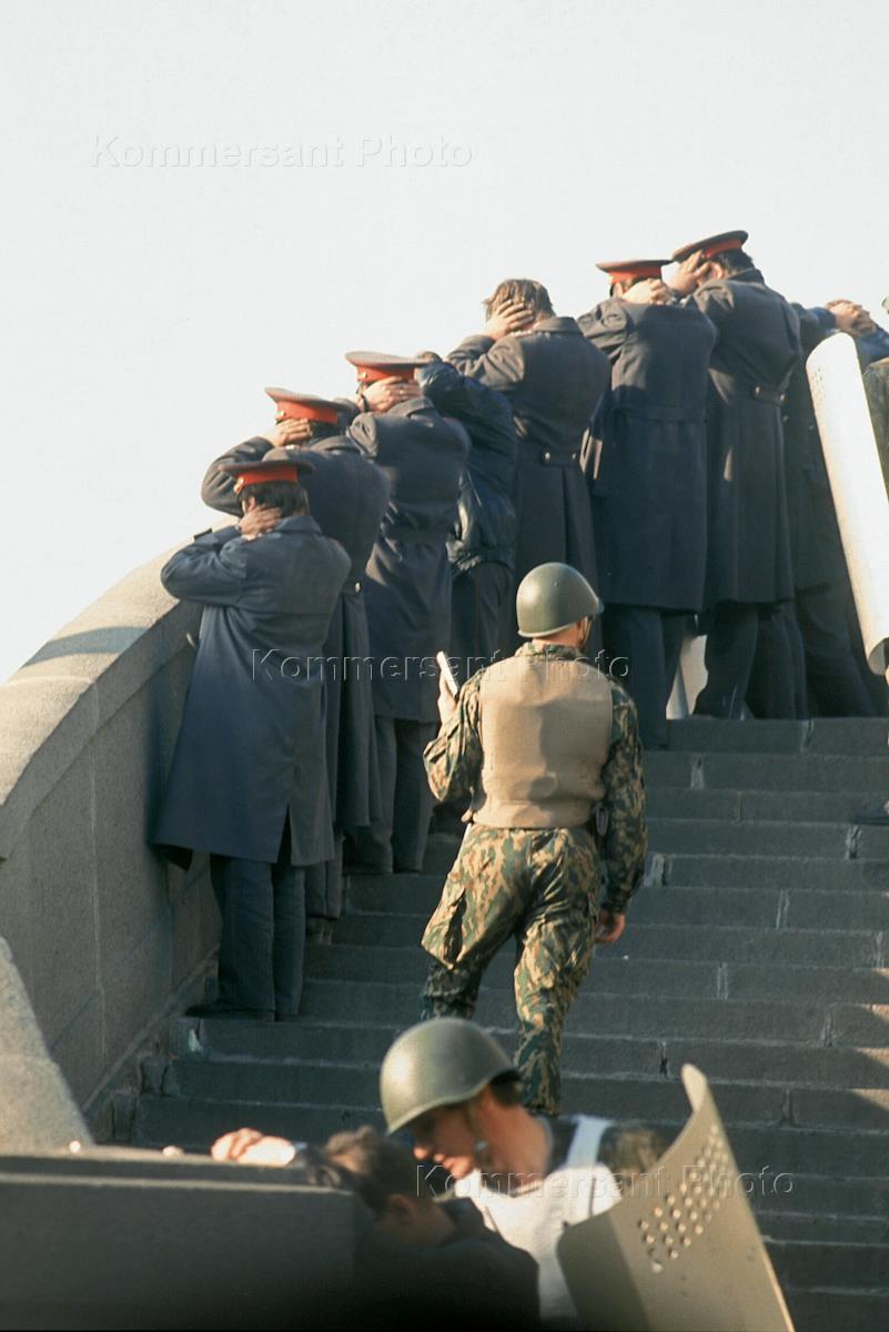 A soldier guards disarmed policemen lined up on the Supreme Council front stairs in October 1993, during the stand off between President Boris Yeltsin and the federal parliament.
