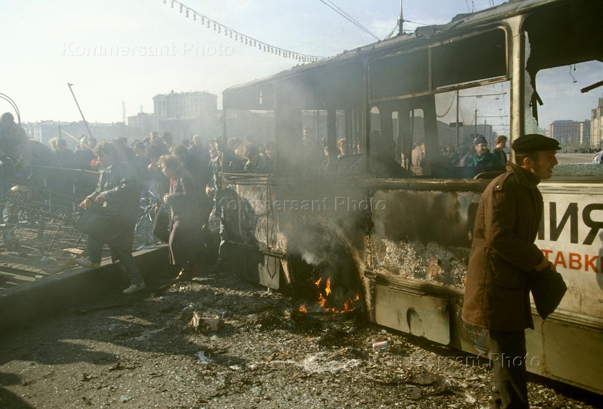 A trolley-bus burned down during the October 1993 armed conflict between the Supreme Council (Soviet-style parliament) and President Boris Yeltsin.