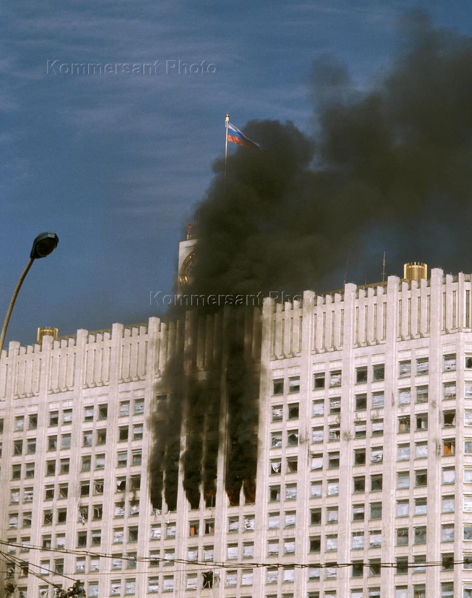 Moscow "White House" - the seat of Supreme Council (federal legislature under the previous Russian constitution) - aflame after it had been shot at by the armed forces who remained loyal to President Boris Yeltsin during the stand off between him and Supreme Council.