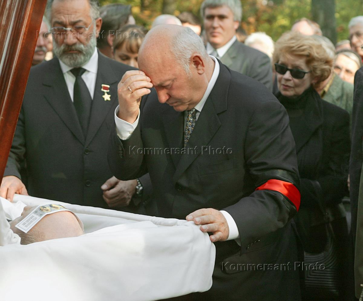 Vice speaker of the State Duma Artur Chilingarov (left) and Moscow Mayor Yury Luzhkov (right) stand by the coffin of the late Yury Senkevich - popular Russian television host during the funeral ceremony on the Novodevichye Cemetery.