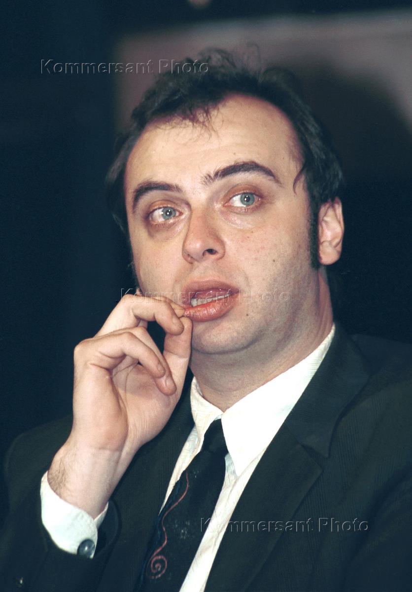 Заместитель председателя Комитета Государственной Думы России по бюджету и налогам Михаил Задорнов (слева), главный режиссер театра "На Таганке" Юрий Любимов (справа) и Каталина Любимова (вторая справа) в фойе театра перед началом спектакля.