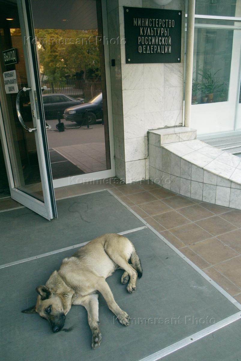 Спящая дворовая собака у входа в здание Министерства культуры России.