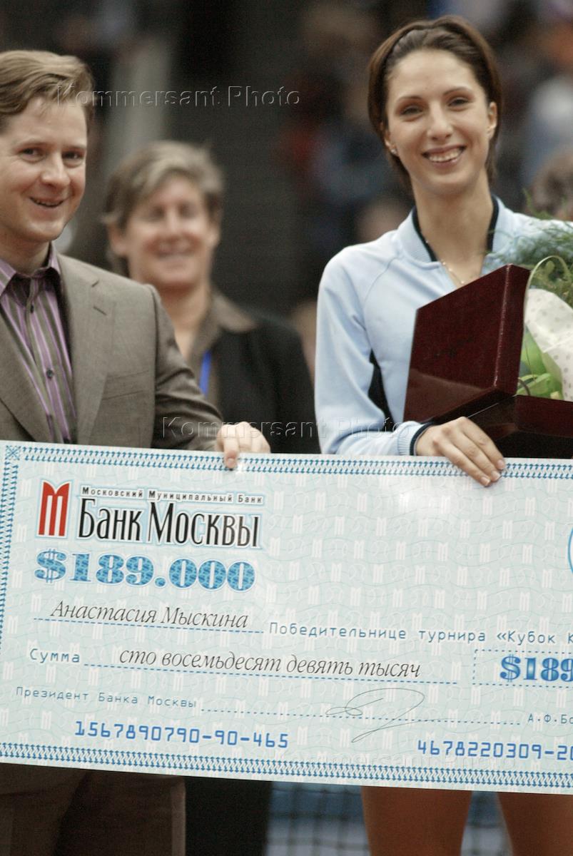 Tennis player Anastasia Myskina (right) and the president of the "Bank of Moscow" Andrei Borodin (left) took part in the "Kremlin Cup" tournament in the "Olympisky" complex. Anastasia Myskina was the first russian who won the "Kremlin Cup". She holds a check of a winner.