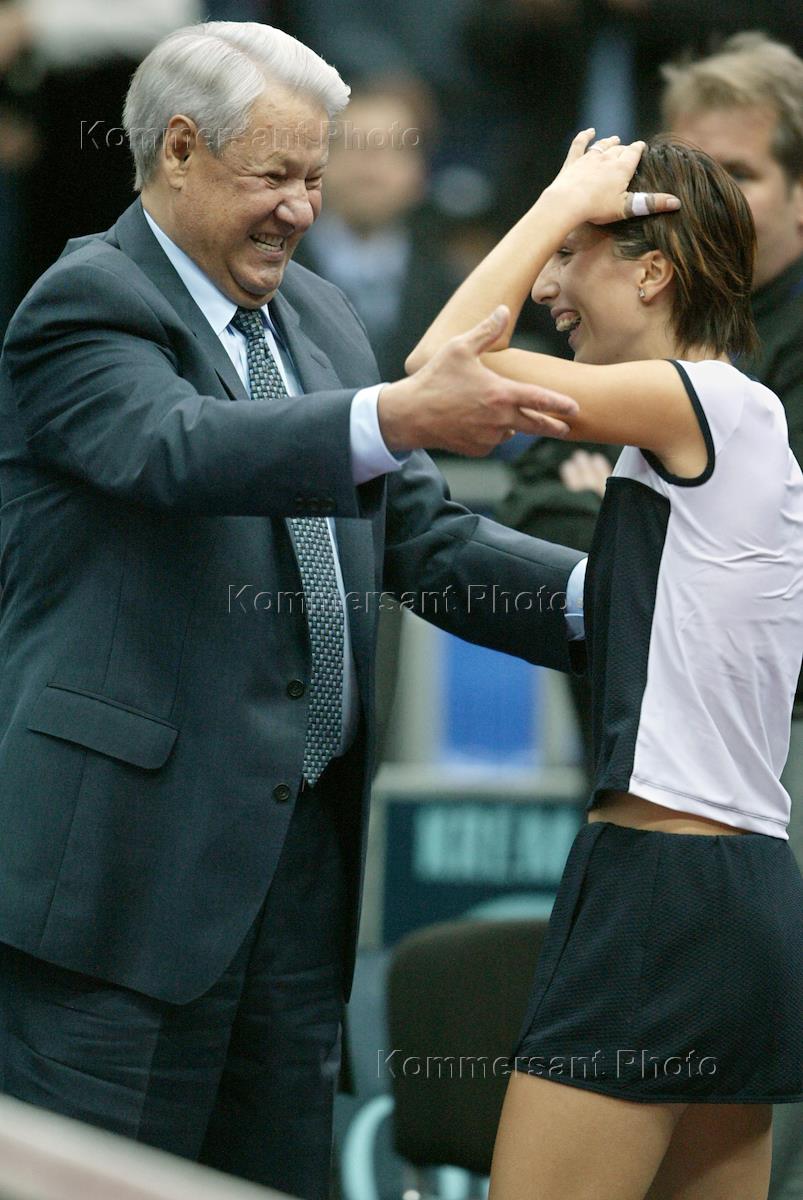 Первый Президент России Борис Ельцин (слева) поздравляет теннисистку Анастасию Мыскину (справа) с победой в финальной игре турнира "Кубок Кремля", который состоялся в спорткомплексе "Олимпийский". Анастасия Мыскина первой из российских теннисисток сумела выиграть "Кубок Кремля".