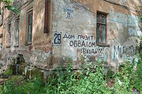 Жанровая фотография. Аварийный жилой дом под снос на улице Торпедо. Надписи на стенах - "Дом грозит обвалом! Не входи-смерть!".