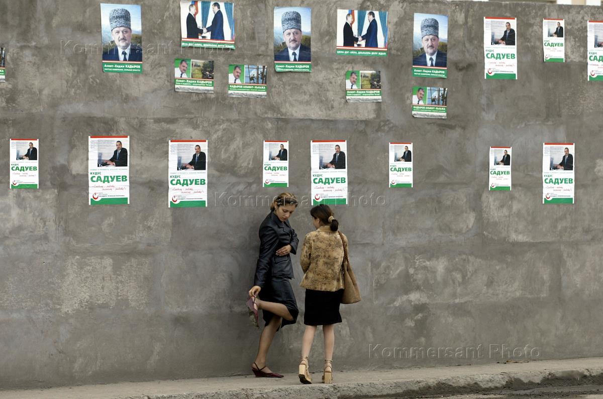 Выборы президента Чеченской Республики. Девушка поправляет туфли на фоне плакатов предвыборной кампании А.Кадырова и К.Садуева, расклеенных на глухой стене.