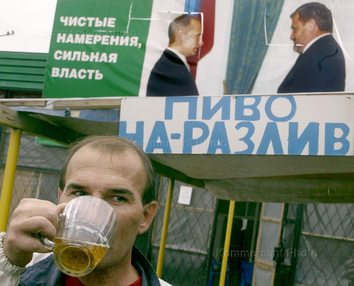 Выборы президента Чеченской Республики. Мужчина пьет пиво под плакатом предвыборной кампании исполняющего полномочия президента Чеченской республики Ахмата Кадырова.
