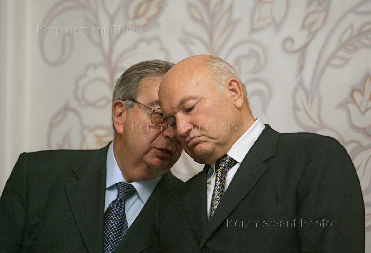 President of the Russian Trade and Commerce Chamber (TPP) Yevgeny Primakov (left) confers with Moscow Mayor Yury Luzhkov during the joint meeting of the 'Orthodox Encyclopedia' editorial and trustee boards. The meeting was held in the Christ the Savior Cathedral.