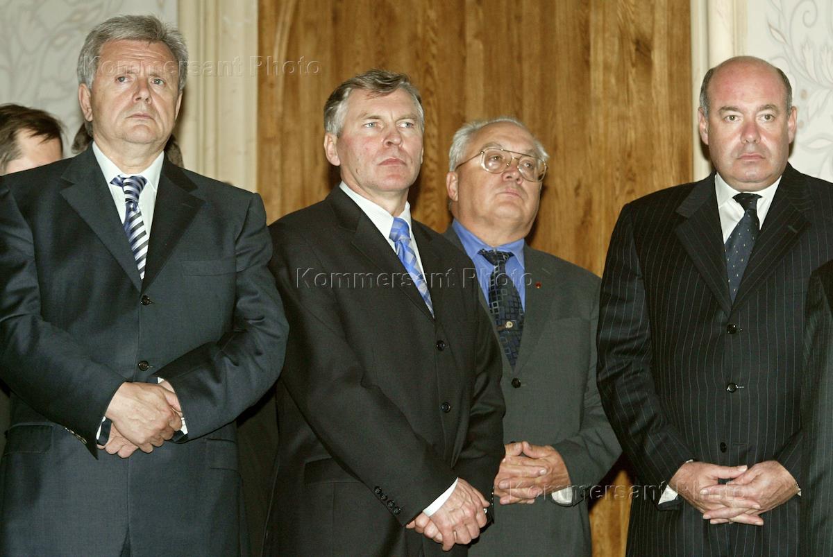 Left to right: Samara Oblast Governor Konstantin Titov, Russian Education Minister Vladimir Filippov, Moscow Lomonosov University (MGU) Rector Victor Sadovnichy, and Russian Culture Minister Mikhail Shvydkoy take part in the joint meeting of the 'Orthodox Encyclopedia' editorial and trustee boards. The meeting was held in the Christ the Savior Cathedral.