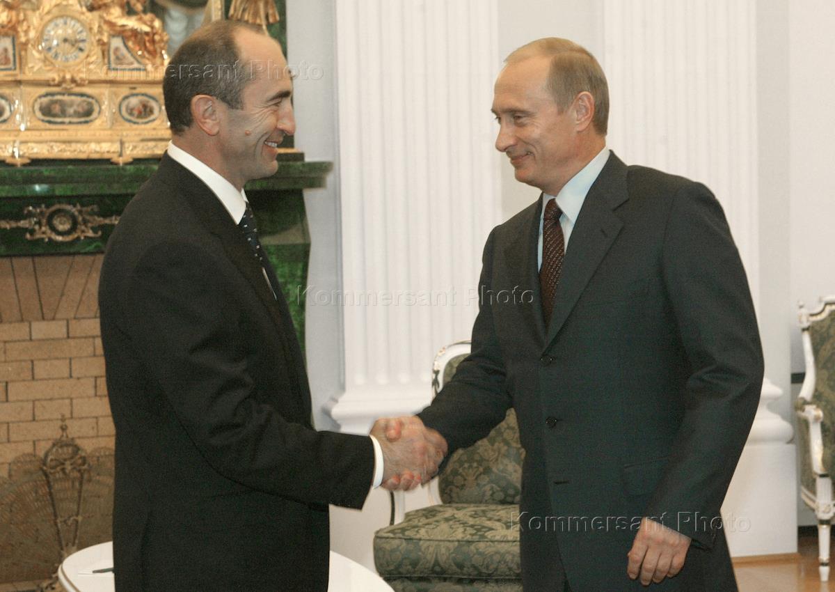 Президент Армении Роберт Кочарян (слева) и Президент России Владимир Путин (справа) во время встречи в Кремле.