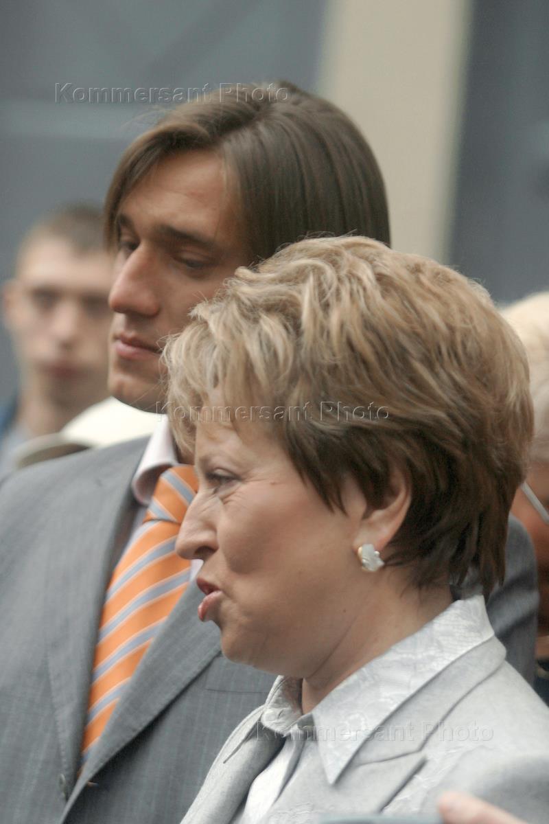 Russian presidential representative in the North West Federal District, St.Petersburg governor candidate Valentina Matviyenko (right), acconmpanied by her son Sergey Matviyenko (left), arrives at a polling station to cast her vote.