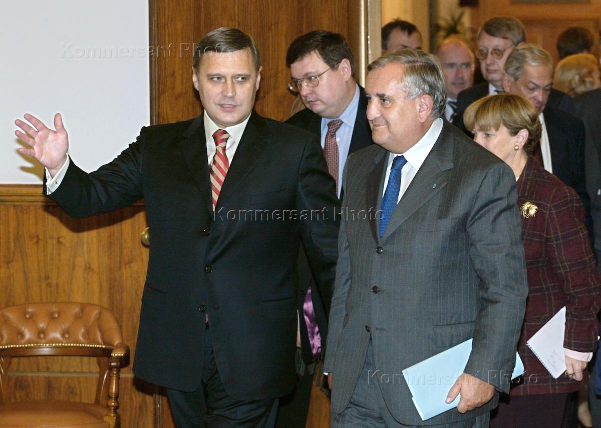 Председатель Правительства России Михаил Касьянов (в центре) и премьер-министр Франции Жан-Пьер Раффарен (справа) во время официальной встречи в Доме Правительства России.