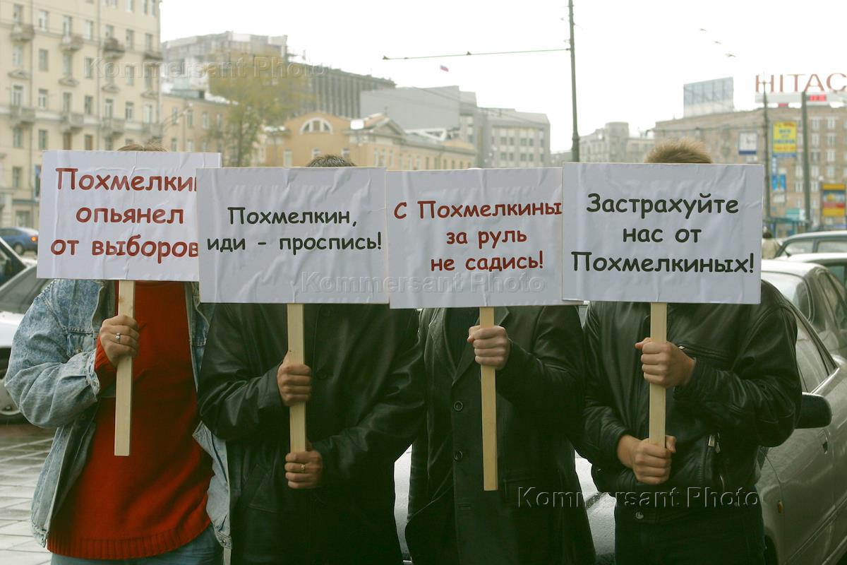 Participants of the rally stand in front of the RIA "Novosti" office where was held the news conference "Annulation of the oblagatory car insurance law" of Viktor Pokhmelkin.