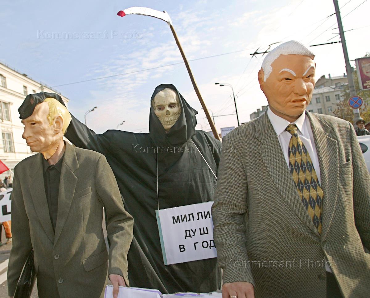 Участники митинга в масках Ельцина, Путина и смерти. Митинг, приуроченный к 10-летию событий октября 1993 года и организованный МГК КПРФ, комитетом памяти жертв событий сентября-октября 1993 года в Москве, движением в поддержку армии, прошел на Калужской площади.