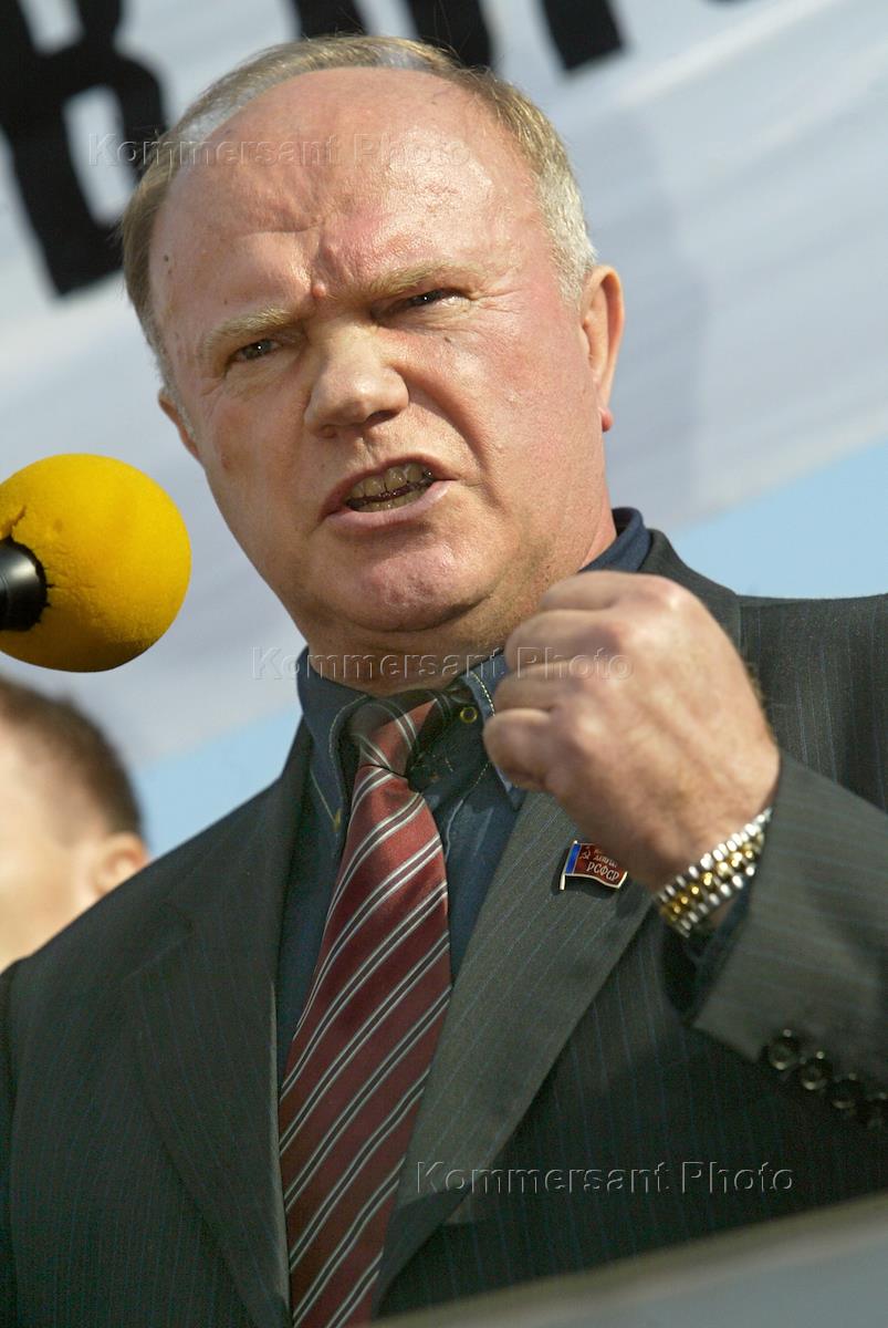 Лидер Коммунистической партии России (КПРФ), член Совета Государственной Думы России Геннадий Зюганов на митинге, приуроченном к 10-летию событий октября 1993 года и организованном МГК КПРФ, комитетом памяти жертв событий сентября-октября 1993 года в Москве, движением в поддержку армии. Митинг прошел на Калужской площади.