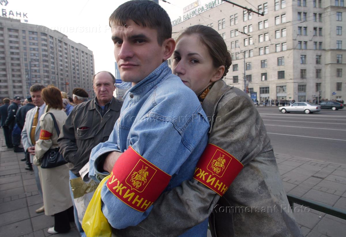 Participants of the rally. The rally was devoted to the 10th anniversary of the October 1993 tragic history and organised by the Russian Communist Party, victims commemoration committee and Army Support movement. It was held at the Kaluzhskaya square.
