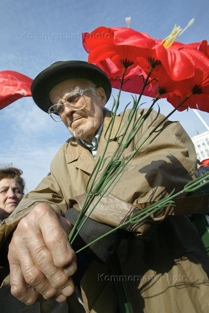 Participant of the rally holds flowers. The rally was devoted to the 10th anniversary of the October 1993 tragic history and organised by the Russian Communist Party, victims commemoration committee and Army Support movement. It was held at the Kaluzhskaya square.