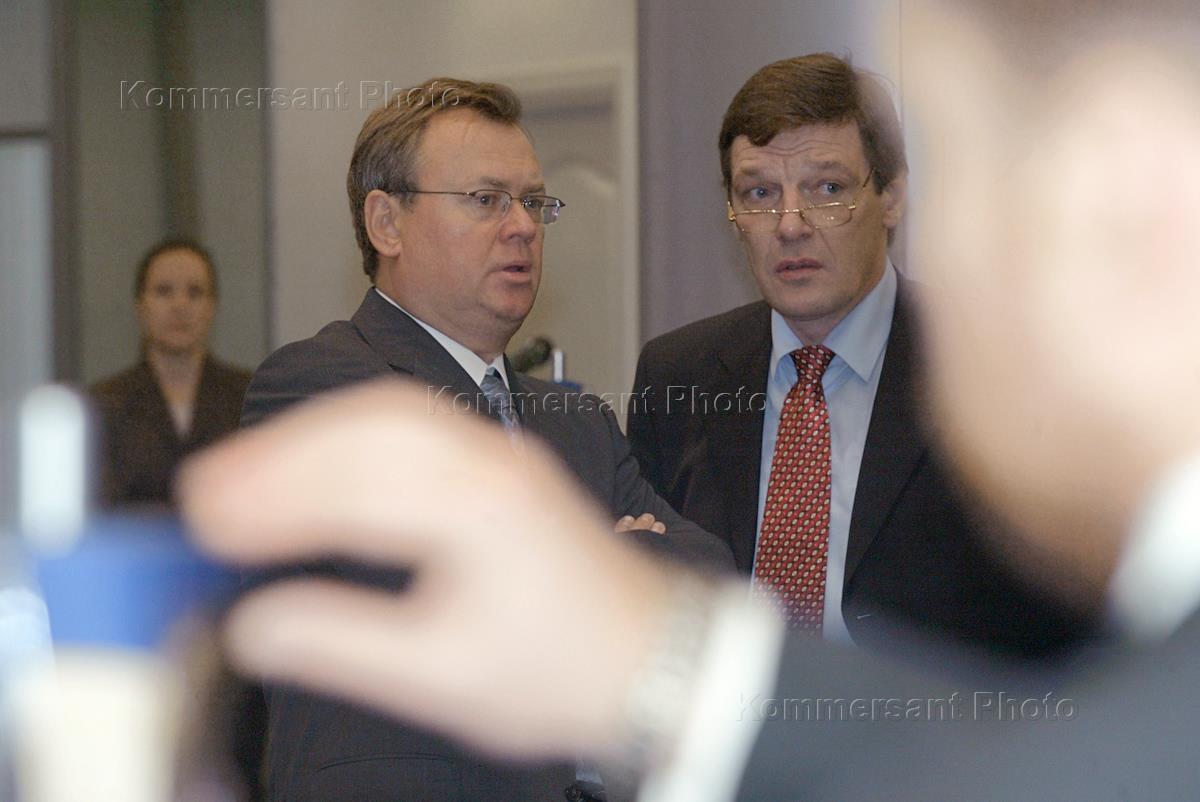 Заместитель председателя Комитета Государственной Думы России по кредитным организациям и финансовым рынкам Владимир Тарачев (слева) и президент, председатель правления "Внешторгбанка" (ВТБ) Андрей Костин (в центре) на церемонии открытия ипотечного центра ВТБ в бизнес-центре "Чайка-Плаза".
