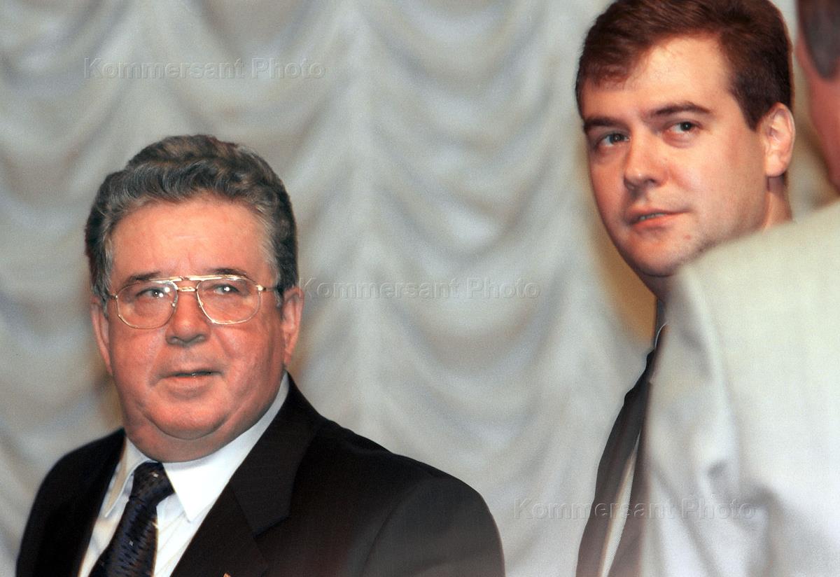 Председатель РАО "Газпром" Рэм Вяхирев (слева) и, избранный на пост сопредседателя "Газпрома" вместо Виктора Черномырдина, 35 летний юрист Дмитрий Медведев, работавший под руководством вице-мэра Санкт-Петербурга Владимира Путина в середине 90-х, перед годовым собранием акционеров общества.
