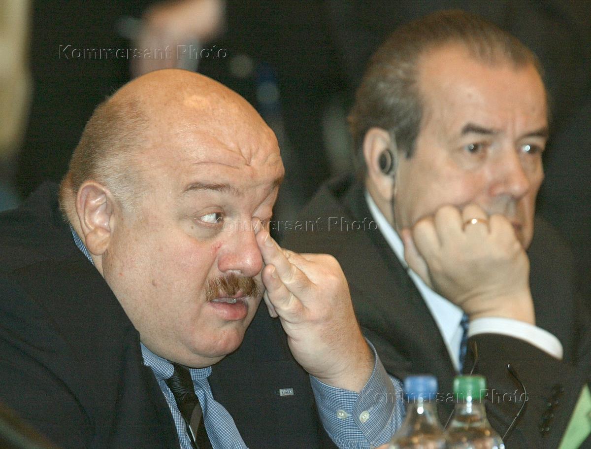 Генеральный директор ОАО "Уральские машиностроительные заводы" Каха Бендукидзе (слева) и председатель Союза российских промышленников и предпринимателей Аркадий Вольский (справа) во время проведения шестых межгосударственных российско-германских консультаций. В центре обсуждения стояли вопросы международной политики, развития германо-российского сотрудничества в области экономики и политики безопасности.