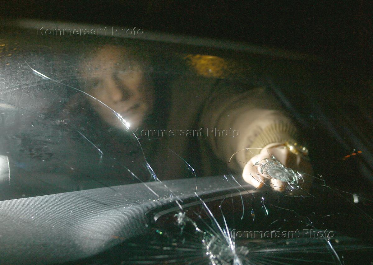 Former owner of AvtoBank Andrey Andreyev pints to his car's windscreen damaged by a bullet during the attempt to murder him.