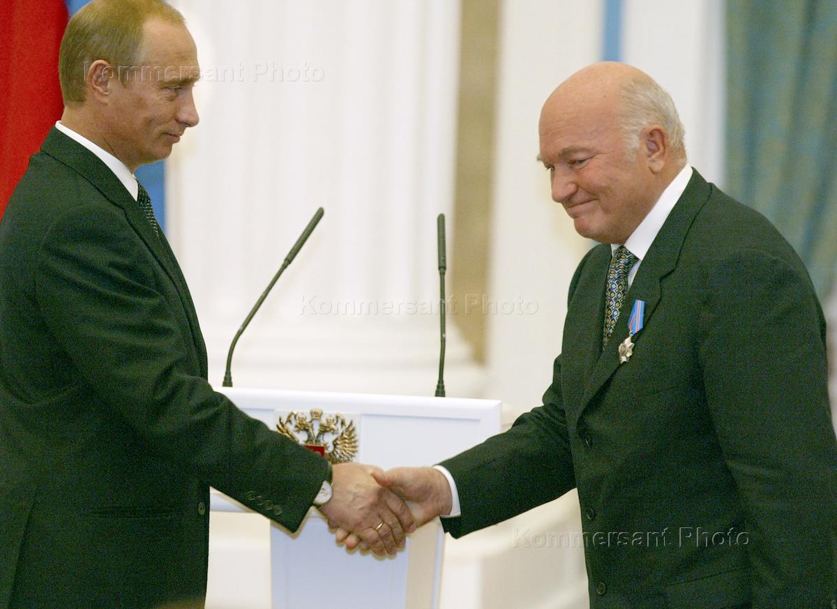 Президент России Владимир Путин (слева) вручает мэру Москвы Юрию Лужкову (справа) орден "За военные заслуги" на церемонии награждения государственными наградами России ученых, политиков и государственных деятелей. Церемония состоялась в Екатерининском зале Большого Кремлевского дворца.